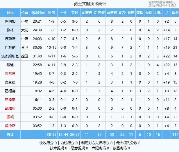 勇士数据:巴特勒21分9板7助2断、理查德15分3板1助、波斯特14分8板2助、波杰姆斯基14分6板1助2断、穆迪13分3板1助2断、霍福德12分4板1助3帽、希尔德8分4板2助、库明加5分8板2助