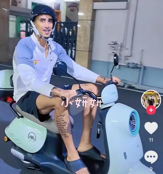 有球迷上传视频,画面中是广东队新外援奎因,此刻他正骑着电动车,还戴着头盔。
