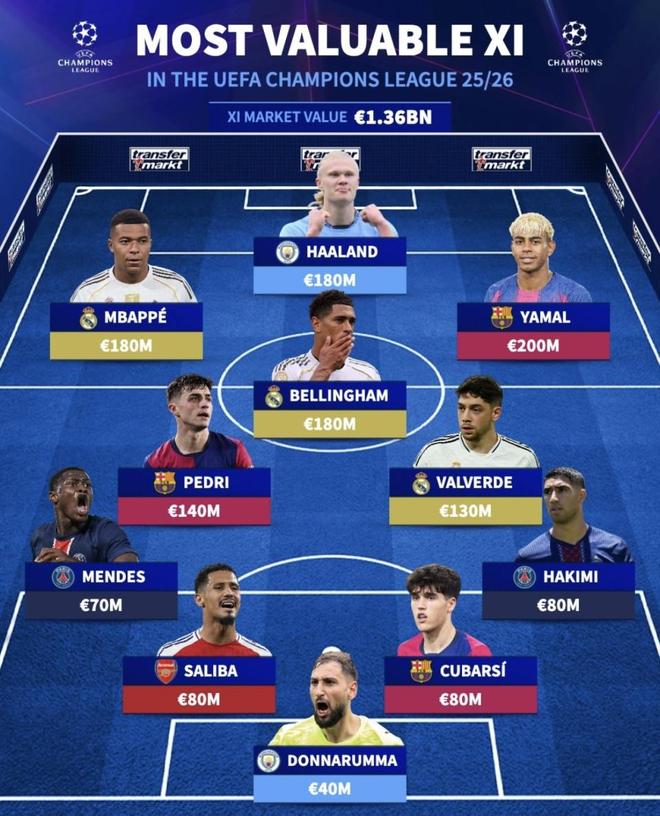 截至北京时间2025年9月18日,德国转会市场的估值显示:2025/26赛季欧冠“最具身价11人”总身价高达13.6亿欧元。锋线由姆巴佩、哈兰德、亚马尔领衔;中场坐镇的是贝林厄姆、佩德里、巴尔韦德;后防由萨利巴、库巴尔西、哈基米、努诺·门德斯组成,门将为多纳鲁马。下文小编将按位置逐一呈现并做实力评估。